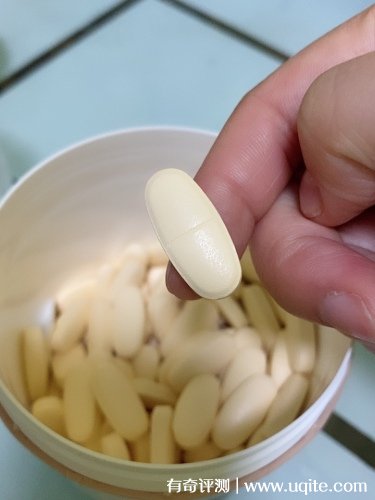 鈣片是奶黃色的,顆粒不算很大,這款鈣片是非咀嚼的產(chǎn)品,通常用溫水服下即可,如果有吞服困難者可以掰斷使用。鈣片入口其實(shí)沒(méi)有什么特別的味道,就和平時(shí)吃感冒藥一樣。
