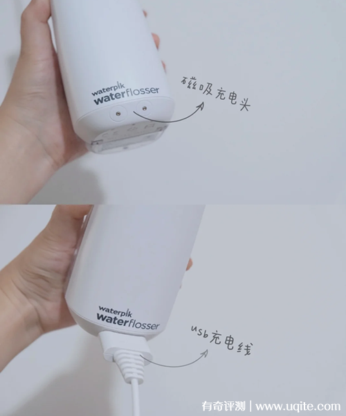 而我現(xiàn)在就只用了標(biāo)準(zhǔn)噴頭,使用時沿著牙齦線沖洗,會稍稍有點酸爽感,但同時也發(fā)現(xiàn)原來自己的口齒間有這么多臟東西。另外要夸的是,潔碧這款水牙線充電也太方便了,是usb磁吸的那種,往上一靠就可以了。續(xù)航也比較厲害,充電4小時,可以用2周左右,出差旅行都可以帶著。