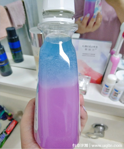 這款漱口水是分上下兩種顏色成分的,在使用前記得搖勻一下,然后再直接倒入瓶蓋中使用就可以了,我一般半蓋就能清潔一次口腔。漱口水入口很溫和,一點(diǎn)也不辣,而且香味很好聞。