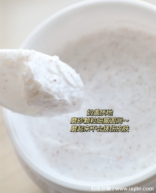 它的質(zhì)地有點像冰沙的感覺,軟軟糯糯的,非常好推開,磨砂顆粒也不像其他的那么大,太大的顆粒很難推開,也很難洗干凈,這個顆粒是那種細細的,很好推開,用在皮膚上也不會有刺痛的感覺。