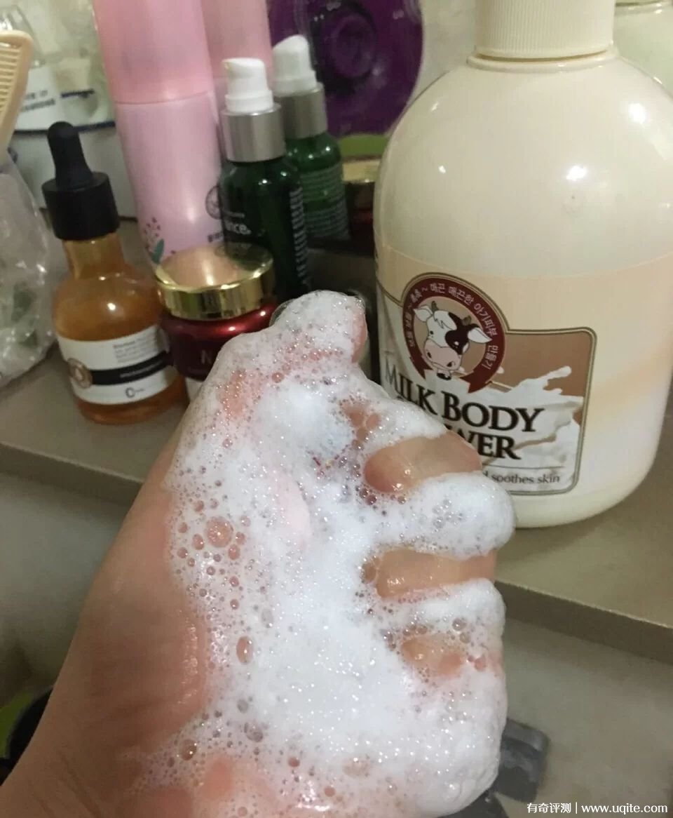 所望牛奶沐浴露味道是淡淡的牛奶味,香精感不重,確實(shí)還挺好聞的,味道也還算持久,晚上用的,隔天醒來還有點(diǎn)淡淡的味道。起泡性不錯(cuò),隨隨便便揉一揉就很多泡泡,上身輕輕柔柔的,很舒服。