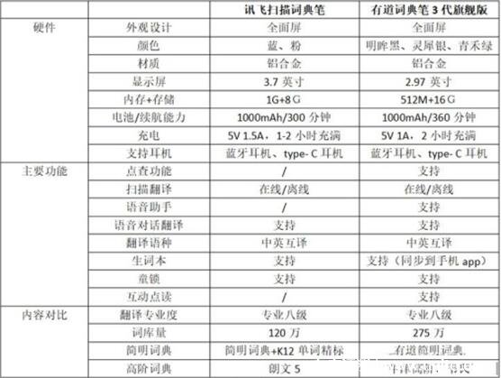 首先,我們來看一下有道詞典筆和科大訊飛詞典筆各個(gè)參數(shù):