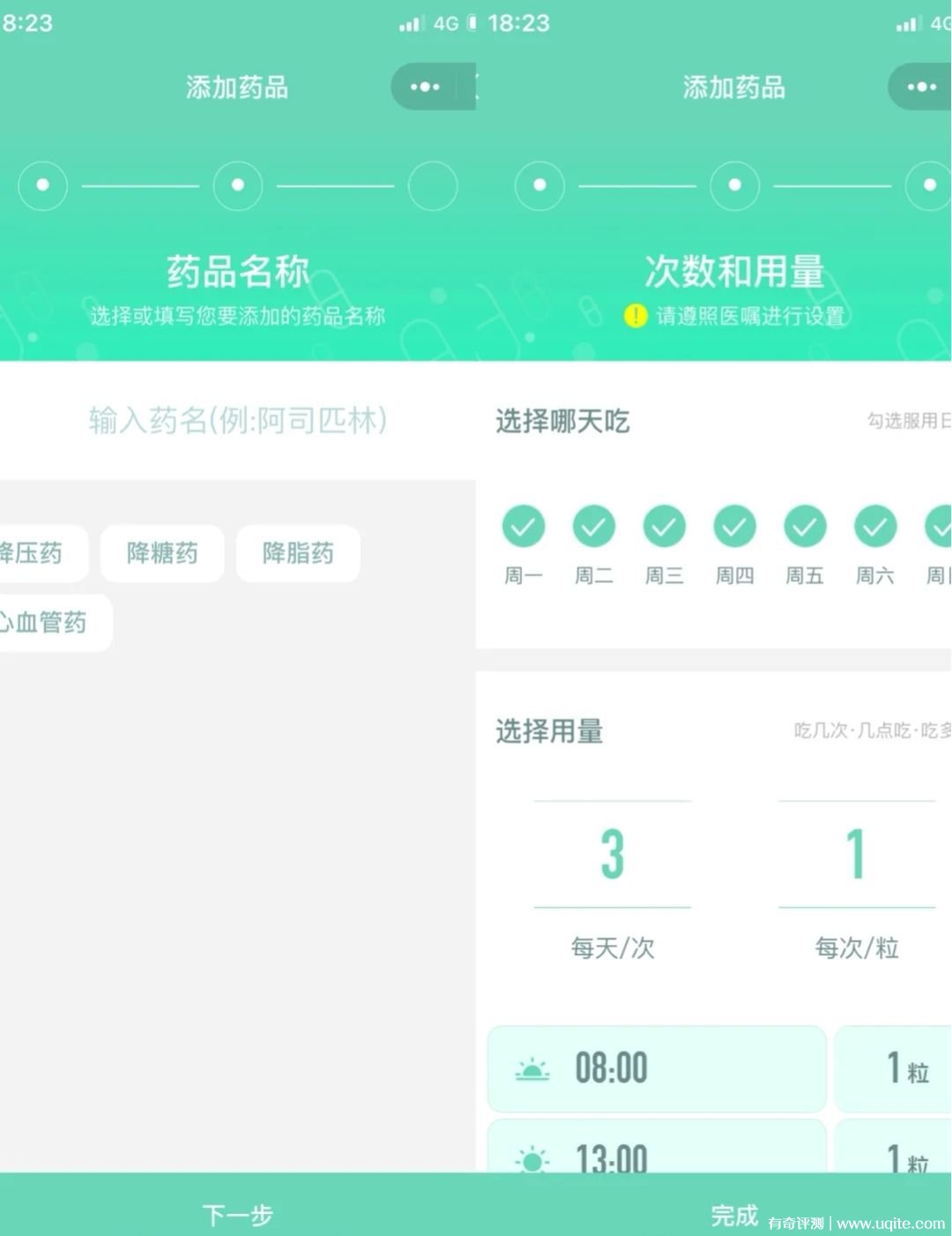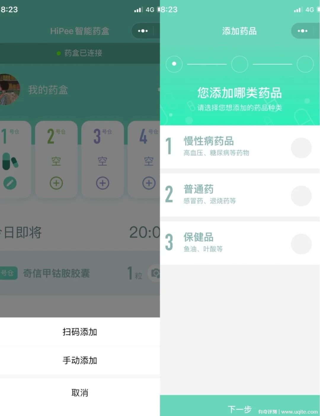 hipee藥盒很智能的一個(gè)點(diǎn)就是,它里面加的國產(chǎn)藥的話,直接掃描藥盒上的條形碼就行,會(huì)顯示說明,非國產(chǎn)的需要手動(dòng)錄入名字,然后設(shè)定次數(shù)、時(shí)間就好。有雙重提醒,一是藥盒外面和該吃的那格會(huì)亮綠光(不是吃藥時(shí)間打開的話外面亮紅光),然后發(fā)出“滴滴滴”的聲音,再就是微信公眾號(hào)也會(huì)跳出提醒,吃了以后會(huì)顯示已經(jīng)吃了。