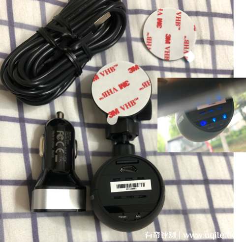 海康威視行車記錄儀很是小巧,全機(jī)只有一個(gè)復(fù)位鍵,在復(fù)位鍵和麥克風(fēng)孔的上方有三個(gè)藍(lán)色指示燈,從左往右依次是錄像指示燈、WiFi指示燈和錄音指示燈,藍(lán)色燈光亮起表示正常工作。附送的車載充電器有兩個(gè)接口,在給??低曅熊囉涗泝x通電源的情況下還能提供一個(gè)USB接口供手機(jī)充電,在僅有一個(gè)點(diǎn)煙口的車上很實(shí)用。