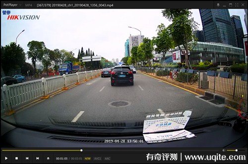 ??低曅熊囉涗泝x放置在玻璃正中間的話視角正好能夠囊括整個(gè)前擋風(fēng)玻璃。白天的清晰度也是比較不錯(cuò)的,在城市公路正常速度行駛的時(shí)候能夠很清晰的看到前車的號(hào)牌和路過(guò)的行人。