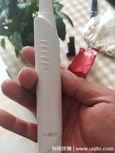 使用感:握著很舒服,刷牙后來追評 產品性能:浪天電動牙刷打開的時候嚇我一跳,嗡——,刷毛動能看得出來 包裝與外觀:好看?。∠笱腊滋煜碌谝唬。?!我已經(jīng)這么黑了我的牙刷絕對不可以! 一打開我還以為是店家漏發(fā)了,后來思考了一下自己的入手價格,嗯...能理解了!看到?jīng)]有電池其實有點小失落,擰開底下一看,啊哈!是有電池的!很貼心喔,贊 刷頭是單獨包裝的,一小袋一個刷頭,給買家一個安裝刷頭的小建議,看刷頭下邊的凹槽,對準牙刷棒凸的地方,然后用大勁把它們按一起,完成!安裝好以后不容易掉的,我觀察了一下,挺緊密 震動聲音有點響,我猝不及防給驚的抖了一下 一共有五檔,記得看說明書選擇!