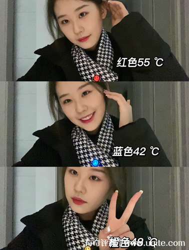 飛樂思發(fā)熱圍巾在使用時,它有三檔溫度可以調(diào)控,其中藍色是一檔(42度),橙色是二檔(48度),紅色是三檔(55度),這樣在不同的氣溫情況下可以自行調(diào)節(jié),還蠻方便的。而且飛樂思發(fā)熱圍巾的發(fā)熱速度很快,基本上一分鐘不到就能感覺它熱起來了,然后帶上以后整脖子就徹底暖和了。