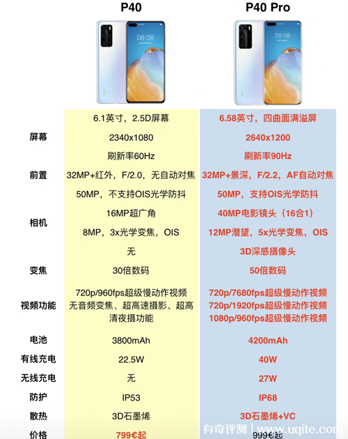 兩者均前置3200萬像素+紅外鏡頭雙攝,p40后置超感知徠卡三色,分別是5000萬廣角鏡頭+1600萬超廣角鏡頭+800萬長焦鏡頭三攝,可支持3倍光學(xué)變焦。p40pro后置采用5000萬廣角鏡頭+4000萬超廣角電影鏡頭+1200萬超感光潛望式長焦鏡頭+TOF景深鏡頭四攝,可支持5倍光學(xué)變焦。