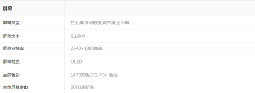 屏幕:屏幕尺寸6.1英寸,屏幕色彩1670萬色,分辨率FHD+ 2340 × 1080 像素,看電影更加舒暢。