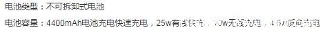 4400mAh電池容量,25w有線快充,10w無(wú)線充電,4.5w反向充電。實(shí)際用戶反映電池耗電速度快,充電速度在目前市面上也不算快。