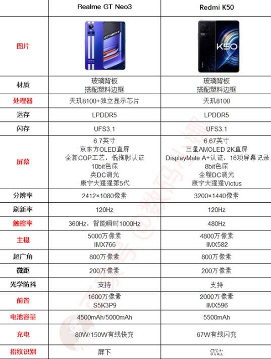 總體上來看,realme GT Neo3擁有更好的傳感器,后置的配置要比紅米k50好,不過前置攝像頭卻是紅米k50更勝一籌。