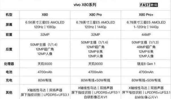 從圖中的消息來看,vivo x80系列的配置都還是非常不錯的,其中屏幕都采用的是三星的E5 AMOLED屏幕,這塊屏幕的素質(zhì)非常高,除了標準版vivo x80。其他兩個版本都是1440P分辨率,超大杯vivo x80還支持1-120Hz自適應(yīng)刷新率,令手機在流暢的同時更加省電,可以說是無可挑剔。