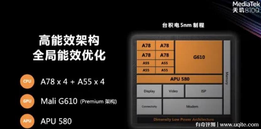 天璣8000max采用的5nm芯片組,頻率僅僅只比天璣8100低0.1GHz,并且天璣8000max使用的是八核芯片,具有四個(gè)Cortex A78 高性能內(nèi)核和四個(gè)Cortex A5節(jié)能內(nèi)核,主頻為2.75GHz,圖形處理器使用的是Mali-610 GPU,并且還有聯(lián)發(fā)科580 APU,功耗性能都兼顧到了,是非常好用的處理器。