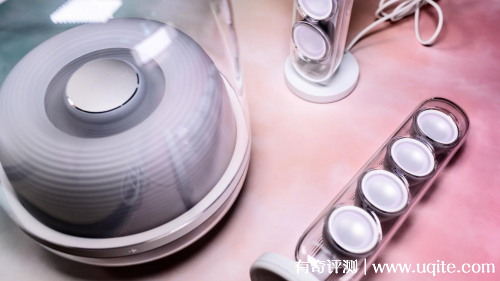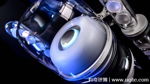 打開播放鍵,無線水晶四將展現(xiàn)出流光溢彩的環(huán)形狀態(tài)指示光效,機身內(nèi)部新增加了呼吸夢幻藍(lán)色燈光,優(yōu)雅的波紋光影效果,絢麗光影,光隨樂動。