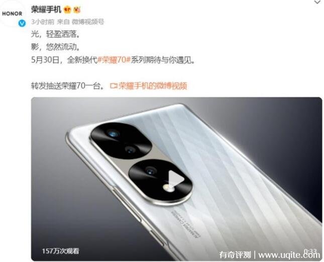 榮耀手機(jī)官微最近官宣了榮耀70的發(fā)布時(shí)間,榮耀70系列手機(jī)將于2022年5月30日發(fā)布,從官方給出的視頻來看,這次的榮耀70外觀和性能都有了全方位的升級,無論是顏值還是性能都可以說是非常能打了。就單從外觀來看,就已經(jīng)令人感嘆,這已經(jīng)不止是手機(jī)了,更像是一件藝術(shù)品。