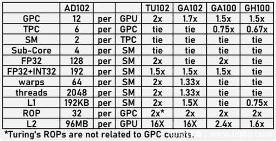 以此同時(shí),kopite7kimi還放出了號(hào)稱是AD102GPU的內(nèi)核設(shè)計(jì)圖,AD102也就是Ada Lovelace架構(gòu)中的次頂配核心,這也將是40系旗艦卡的標(biāo)配,大概率對(duì)應(yīng)著4090和4090ti顯卡。從參數(shù)圖上可以看出,40系顯卡在各方面都要比之前的顯卡提升很多,比如最新的CUDA比之前的安培架構(gòu)提升了50%左右,而單精度性能提升更是達(dá)到了恐怖的100%,光柵單元也足足提升了100%,至于L2顯存更是有著140%的提升。