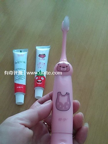 而且有送牙膏,是那種甜甜的味道,是孩子喜歡的類型。第一次用的時候,寶寶還有點怕怕的,我拿著在他牙齒上試了一下,她覺得好像還好,沒有什么,然后就自己開始用了,而且還會邊用邊笑,覺得振動的很好玩。