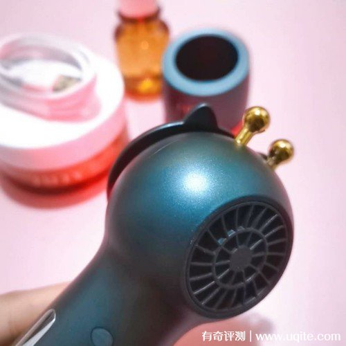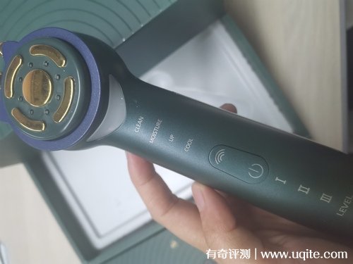 美容儀是墨綠色的,很好看,儀器的設計很精美,拿在手上的感覺非常好,一點也不笨重,而且這款美容儀的上面還有兩個小觸角,是可以用來按摩眼部的,看著就向蝸牛一樣,造型很獨特。除了美容儀,店家還贈送了搭配使用的精華液和卸妝棉,非常貼心。