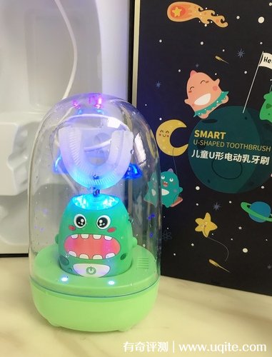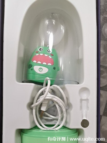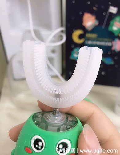 這款牙刷總共有三種卡通造型,我給孩子入手的是這款綠色的小怪獸U型牙刷,電動牙刷的體積不大,很小巧,對于孩子使用來說,是非常適合的,而且U型頭的設(shè)計,孩子放嘴里使用就行,不用再移動了,可以照顧到每一顆牙齒的清潔。