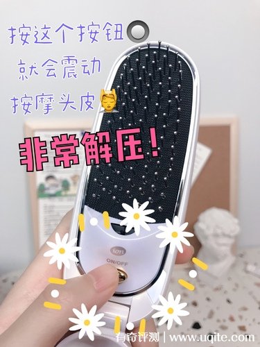 梳子的顏值的體積不大,而且是可以折疊的,出門攜帶也會(huì)很方便,梳齒的下放有一個(gè)金黃色的按鍵,它就是按摩啟動(dòng)開關(guān),開啟它以后梳子就會(huì)開始震動(dòng)模式,可以幫助按摩頭皮,這樣的好處就在于,能夠促進(jìn)頭皮的血液循環(huán),從而改善掉發(fā)脫發(fā)的情況。