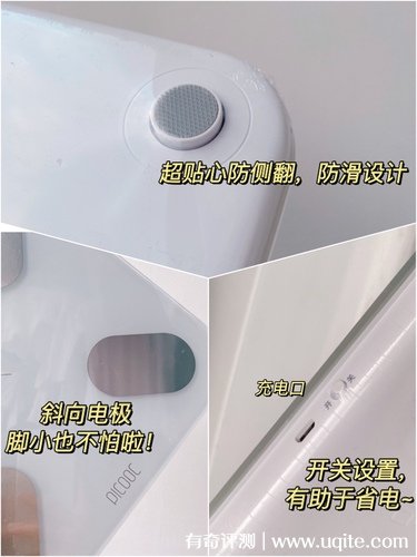 這款體脂稱是充電款,所以在使用完之后,可以隨手開(kāi)關(guān),這樣比較節(jié)能。體脂稱的背后有防滑的橡膠底,在使用是不用擔(dān)心會(huì)有滑動(dòng)的情況,不過(guò)在測(cè)量時(shí)一定要將稱放平,不如會(huì)影響測(cè)量結(jié)果。