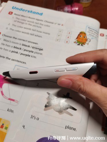 詞典筆的使用操作很簡單,側(cè)邊的紅色按鍵就是開機鍵,旁邊還分別設有音量加減調(diào)節(jié)鍵,在掃描使用的時候,長按筆端的小圓點就可以了。詞典筆不僅能翻譯,而且還有練習發(fā)音和口語的功能。